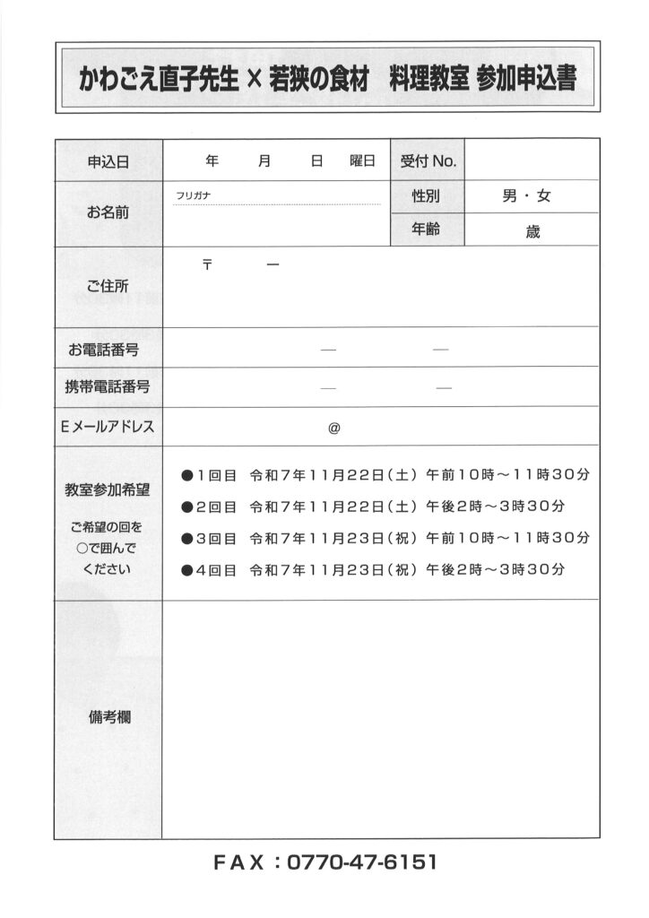 かわごえ直子先生✕若狭の食材 料理教室 参加者募集!!